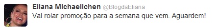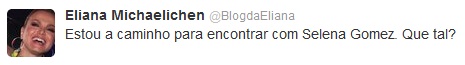 ![]() A apresentadora de tv, Eliana, acaba de tuitar que está a caminho para encontrar a atriz e cantora Selena Gomez, que está no Brasil para a realização de dois shows do Rio de Janeiro e em São Paulo, para fazer uma entrevista para o seu programa da emissora de TV SBT. Confira os tweets abaixo: ![]() Depois concluiu que terá uma promoção envolvendo a cantora para os fãs da mesma. Confira: ![]() Fiquem ligados para mais informações no SGBR! |